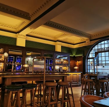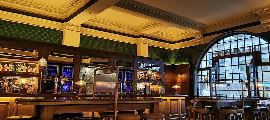 Inside The Colmore, the atmosphere strikes a wonderful balance between historic elegance and modern comfort. The interior is truly stunning – a result of the careful refurbishment of the early 20th-century bank hall that once occupied this space. You’ll immediately notice the original Edwardian Baroque design elements that have been preserved: a decorative marble frieze running along the ceiling, soaring high ceilings clad in glossy green ceramic tiles, and dark wooden panelling up to three-quarter height on the walls. These heritage features give the pub a sense of grandness and character that you just can’t fake. At the same time, the designers have added contemporary touches to make it feel warm and inviting. There’s a magnificent 30-foot-long bar in the main room, topped with marble, and above it hang spectacular chandeliers that cast a soft glow in the evenings. Scattered around are a mix of seating options – tall stools by the bar, leather-upholstered booths along the sides, and marbled-topped tables with comfy chairs. In one corner you might even find a cozy nook that was once part of a bank manager’s office, now perfect for intimate chats. Despite the opulence of the decor, the pub doesn’t feel stuffy or museum-like; it’s chic yet relaxed. The ambiance is often filled with a pleasant buzz of conversation and laughter. Light background music plays (often at a modest volume), but it never overpowers the space – you’ll typically hear the clink of pint glasses and happy patrons talking long before you notice any soundtrack. In fact, the acoustics of the building are surprisingly good – even when it’s busy, the high ceilings and layout mean you can carry on a conversation without shouting, a rare and welcome quality in a bustling bar.