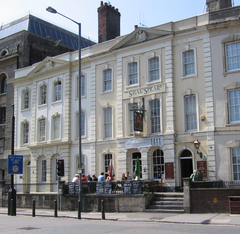 The Shakespeare Tavern’s pale-stone Georgian frontage is one of the most recognisable pub sights along Prince Street, right in the harbourside heart of Bristol. Set inside a Grade II* listed pair of early Georgian houses, the venue is much more than a handy city centre stop for a quick pint. It is a historic waterside pub with real architectural gravitas, a steady pull for real ale fans, and a food offering that sticks closely to classic pub comfort done properly.
