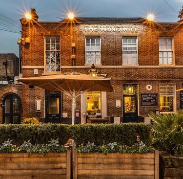 The Windmill also carries intriguing local lore. It is said Robert Baden-Powell, founder of the Boy Scouts, wrote parts of his Scouting for Boys guide here in the early 1900s. Since 1848, The Windmill has been part of the Young’s Brewery family, evolving into the larger pub-hotel seen today, yet still maintaining its Georgian elegance and timeless appeal.