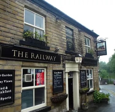 Next the train climbs into the Saddleworth hills to Greenfield station (Uppermill area, Greater Manchester). Opposite the station stands The Railway Inn, a 150-year-old alehouse that still feels like a classic country pub. The Railway Inn’s walls are covered in old Saddleworth photos and kitsch (there’s even an old toilet-seat “throne”), adding to its rustic charm. Behind the pub is a large beer garden overlooking the Chew Valley floor – an ideal spot on a sunny afternoon. The pub is famous locally for live music (it bills itself as “Saddleworth’s premier live music venue”) and a strong selection of cask ales. Regulars and visitors alike enjoy beers from nearby breweries (Deuchars IPA, Bombardier, Golden Pippin, Old Peculiar, and more are often on tap). Note that the Railway Inn does not do hot food, but it has a fine pork pie and a jukebox, plus warm hospitality regardless of age or dress code.
